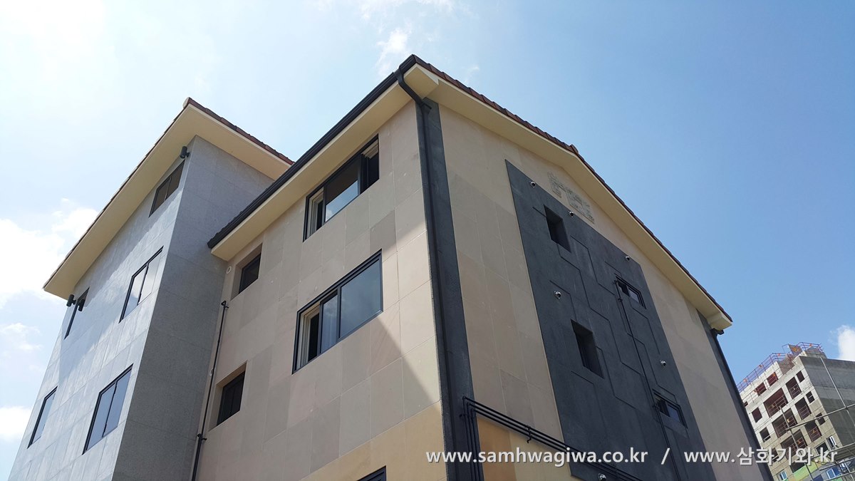 바로 위에 나열한 각상 작업 사진 세 곳과 동일한 위치에서 찍은 사진들입니다. 옥상 난간 부분에는 갓기와를 붙이고 용마루 벤트로 감싸서 용마루 부착 준비를 마친 상태입니다. 누차 강조하지만 콘크리트 건물의 지붕 시공에도 투습방수 기능이 있는 알미늄 벤트로 시공해야 지붕의 내구성과 수명이 보장되므로 아주 특수한 경우가 아니면 대부분 용마루 벤트를 사용하여 시공해 드리고 있습니다.