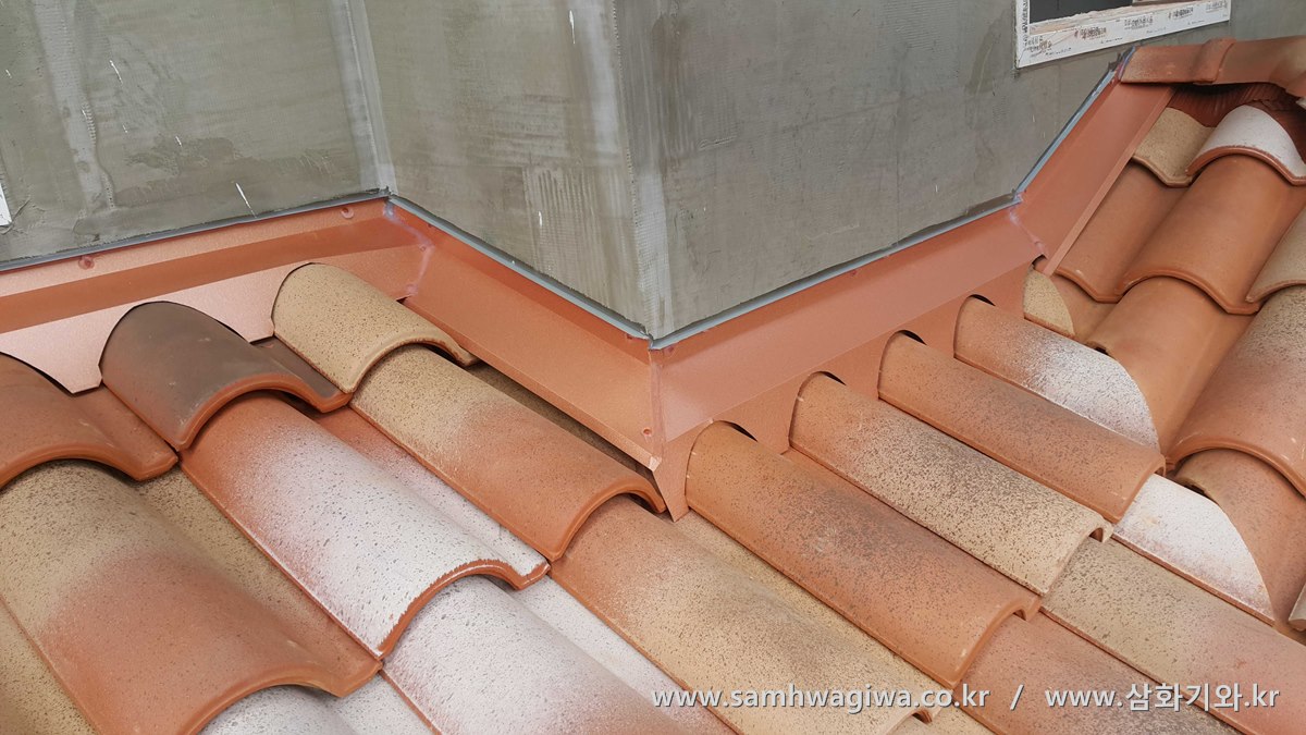 눈썹지붕의 코너 용마루 부분도 전용 벤트를 부착후 용마루를 씌워 마무리한 모습입니다.