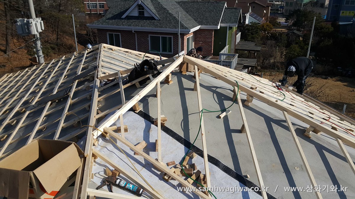 시공일이 되어 각상 작업을 준비하는 모습입니다. 기와골에는 방수시트를 부착하여 혹시 모를 누수에 한 번 더 대비합니다.