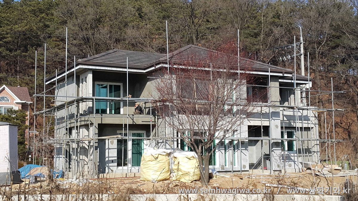 이번 현장은 제천시 고암동에 위치한 2층 개인주택 시공 현장입니다. 콘크리트 골조에 슬라브 지붕으로 설계된 2층 주택으로서 지붕의 형태는 T자형으로 설계되어 있습니다. 이번에 시공될 기와는 점토기와의 최고봉이라고 평가받는 평기와인데요, 일반적인 S형 타입의 기와가 아니라 말 그대로 굴곡이 없이 평평한 스타일의 기와로서 시공 후의 모습이 매우 고급스럽고 세련된 느낌을 준다는 것이 특징입니다.