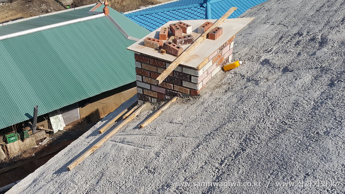 왼쪽 사진은 기와 아래 숨어 있는 안전장치인 빗물 유도 경로이며, 오른쪽 사진은 시공 후 기와 위에 다시 후레싱을 이중으로 덮어 놓은 모습입니다. 이렇게 실리콘과 후레싱으로 이중 삼중 꼼꼼하고 안전하게 마무리해야 빗물 침투에 대비할 수 있습니다. 각상 시공 중에 벽난로 시공팀을 만나서 잠깐 대화를 나누게 되었는데, 벽난로 시공을 하면서 굴뚝 연통 시공 때문에 수많은 지붕을 올라가 보셨는데 굴뚝 주위를 대충 시멘트 몰탈로 마감해 놓고 마는 경우도 허다하게 보셨다고 합니다.