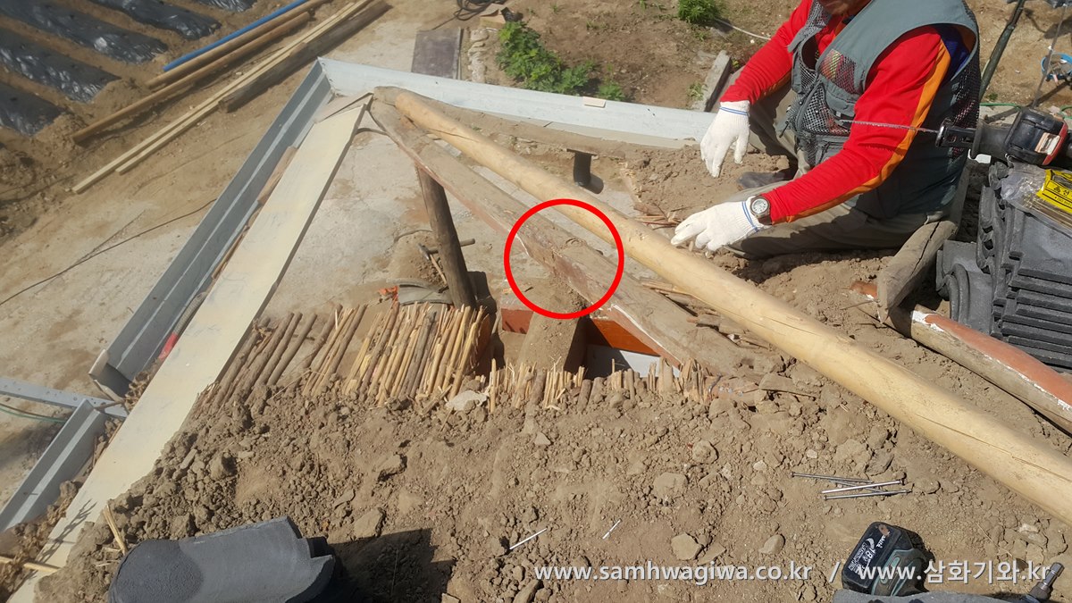 새로 시공할 기와를 지붕면에 올려 편 후에 드디어 기와 시공에 들어갑니다. 시공은 끝기와(추녀)부터 붙여 기초를 잡아 나갑니다.