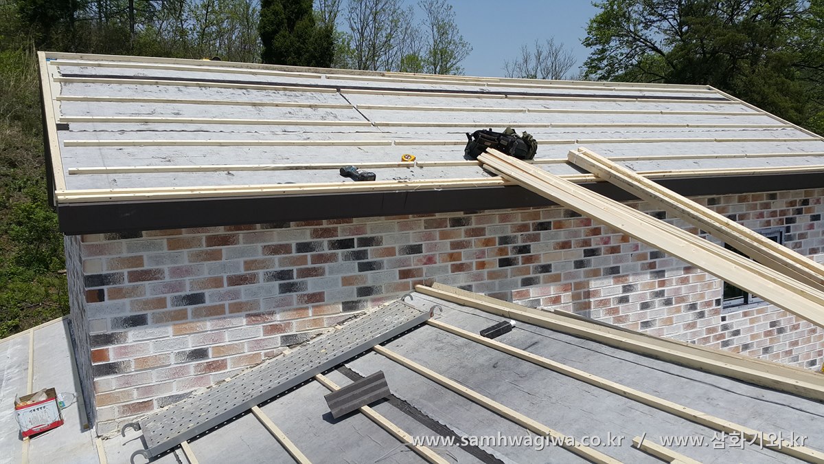 이번 현장은 강원도 영월군 남면 연당리에 위치한 개인주택 증축 현장입니다. 기존 주택에는 아스팔트 슁글로 지붕이 일부 설치되어 있었는데 새로 건물을 증축하면서 시공한 지붕에 맞춰 모두 수입 오지기와로 시공하기로 결정된 현장입니다. 골조와 외벽은 콘크리트에 벽돌로 시공되어 있으며 지붕은 샌드위치 패널로 시공되어 있는 구조입니다.