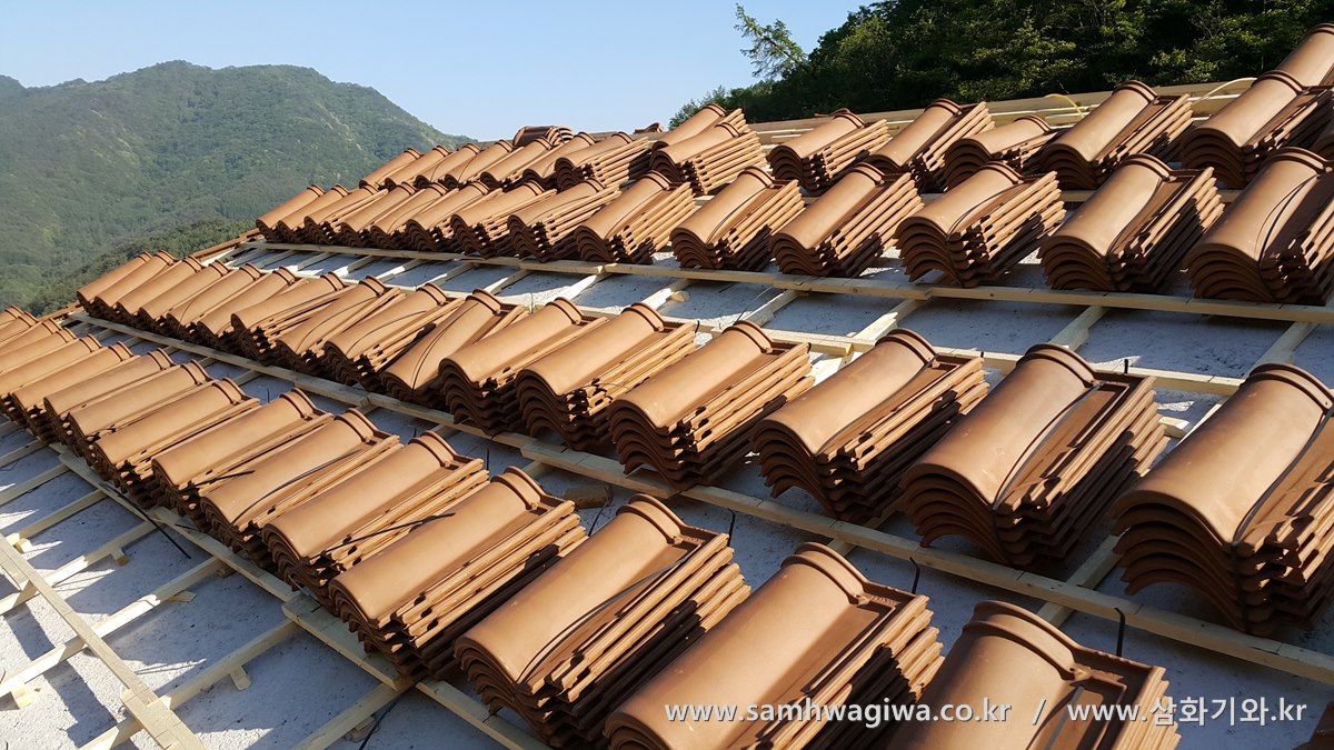 울긋불긋한 변색기와가 주는 아름다움도 있지만 단색기와만이 낼 수 있는 무게감이나 중후함은 또 다른 멋을 선사합니다. 기와를 아직 시공하기 전에 펼쳐만 놓은 상태인데도 고동색의 기와가 뿜어내는 분위기가 대단합니다.