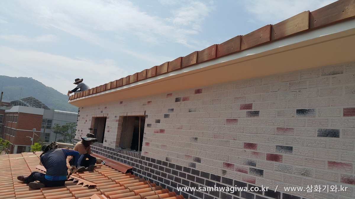 아래쪽 지붕에도 착착 기와가 덮여나가고 있습니다. 밝은 오렌지빛 기와가 산뜻하고 따뜻한 느낌을 줍니다.