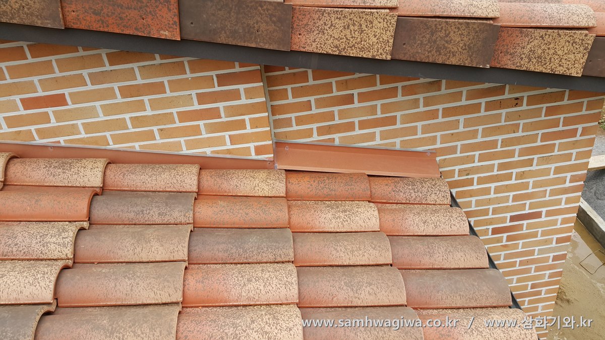 기와가 벽면과 만나는 부분 역시 후레싱을 미리 설치하여 빗물이 흘러갈 경로를 만들어 줍니다.