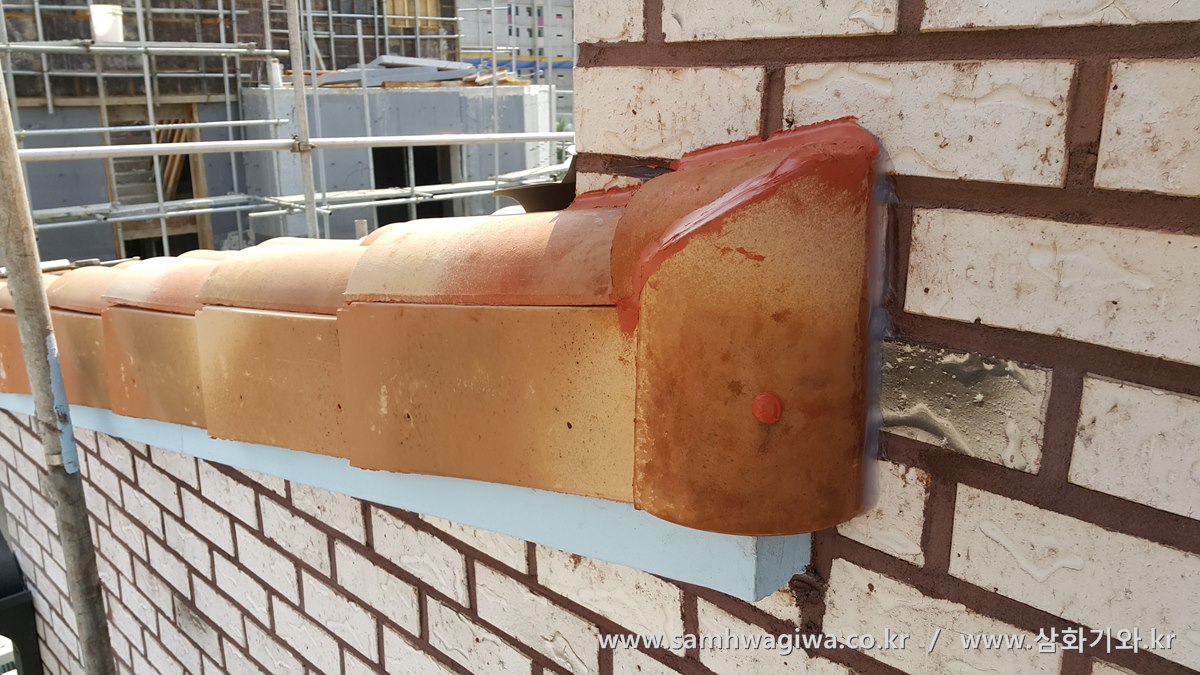 갓기와가 끝나는 부분은 너무 폭이 좁아 박공 머리로 마감이 안 되는 관계로 기와를 잘라 붙여서 마감합니다. 비가 새거나 날아가지 않도록 실리콘과 나사못으로 역시 단단하게 접착하여 놓습니다.