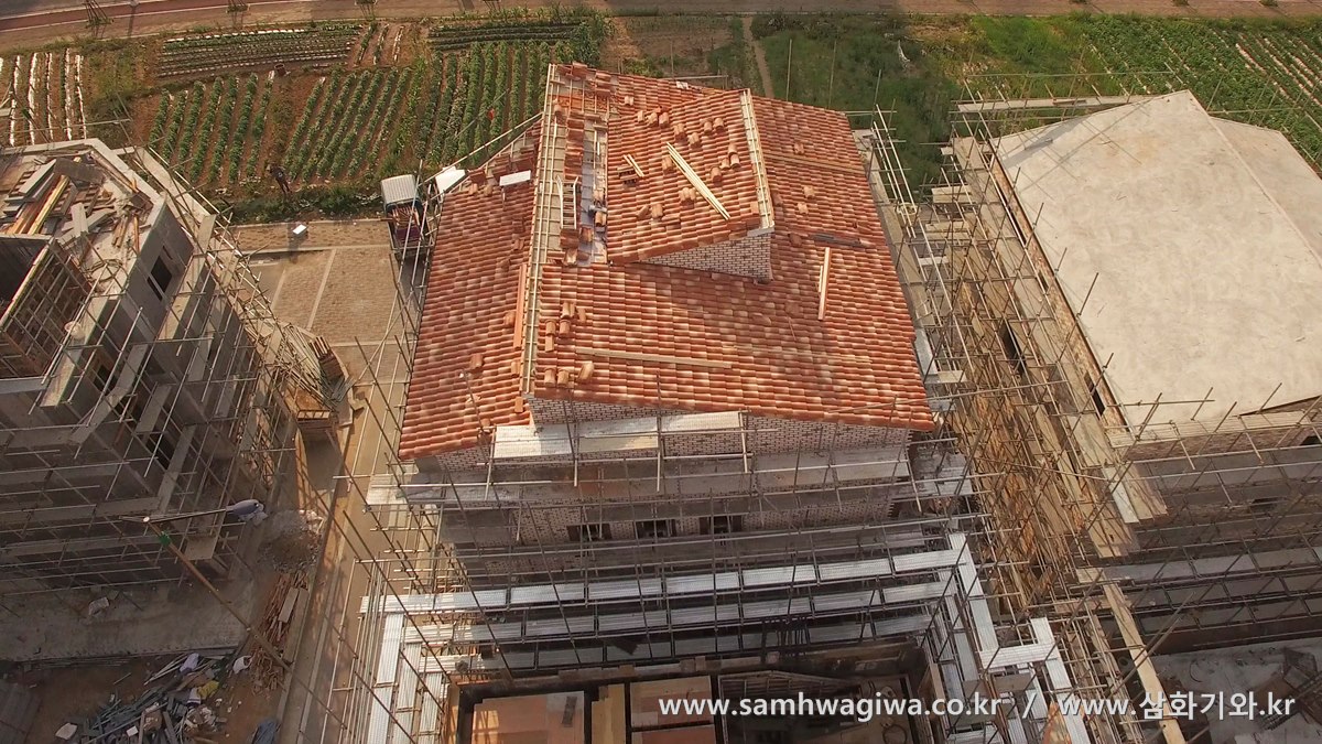 시공이 까다로운 부분을 제외하고는 거의 기와가 덮인 상태입니다. 아래쪽 지붕의 사선과 위쪽의 지붕끼리 만나는 곳은 시간이 많이 소요되므로 다음날에 이어 시공하기로 하고 현장에서 철수합니다.