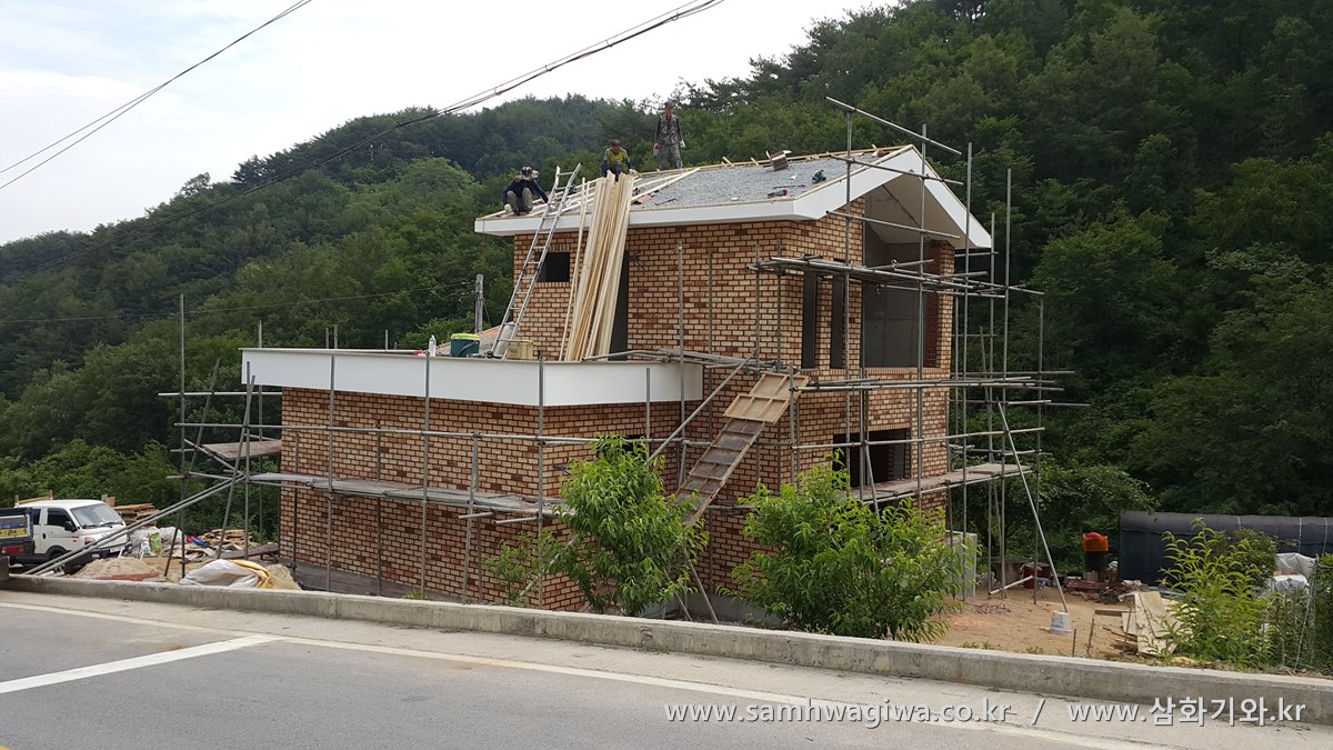 어상천 시내에서 임현리로 향하는 도로를 따라 계속 올라가다 보니 길가에 위치한 현장이 보입니다. 아직 2층에는 거푸집이 제거되어 있지 않은 상태입니다. 기와 시공을 위해서는 슬라브 미장과 벽체 벽돌 작업까지 모두 마무리가 되어 있어야 하므로 실제 시공에 들어가려면 시간이 한참 소요될 것으로 보입니다. 지붕 실측을 끝내고 일단 현장에서 철수합니다.