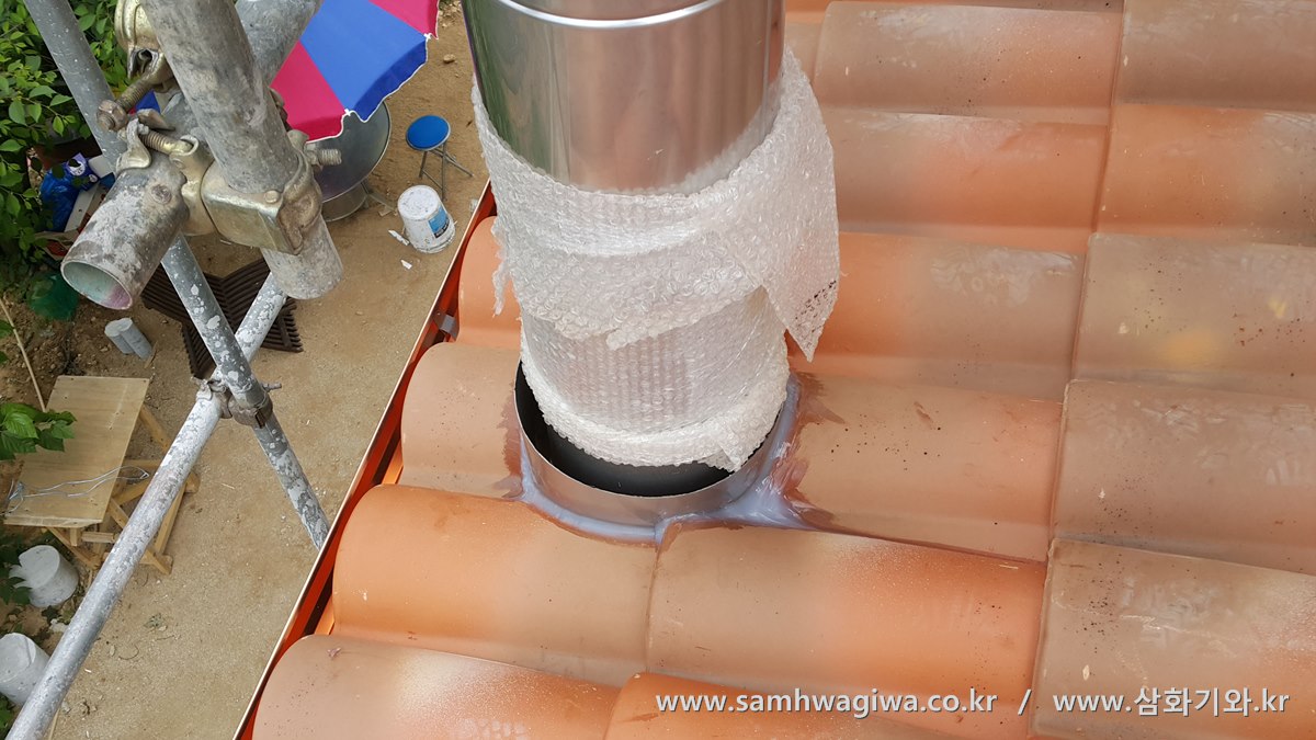 1층 지붕의 뒷쪽에는 사진과 같이 벽난로의 굴뚝이 지붕을 관통하여 설치되어 있습니다. 일반적인 형태의 굴뚝은 벽돌을 사각기둥으로 쌓고 그 안에 연통을 설치하는 것이 보통인데, 이번 현장은 특이하게도 둥그런 연통이 그대로 통과되는 형태입니다. 사각형태의 굴뚝이라면 굴뚝 주위를 후레싱으로 감싸서 방수 작업을 할 텐데 이번 경우는 후레싱을 설치할 방법이 없어 어쩔 수 없이 기와를 둥그렇게 잘라서 실리콘으로 부착합니다. 여러 장을 둥글게 잘라야 하므로 시간과 노력이 많이 소요되었지만 다행히 원활하게 마무리되었습니다. 구조상 어쩔 수 없이 빗물이 고이는 부분이 있지만 역수하지 않도록 실리콘을 꼼꼼하게 발라서 마무리합니다.