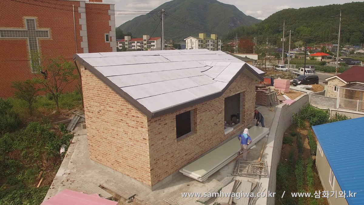 이번 현장은 영월군 덕포리에 위치한 개인주택 신축 현장입니다. 벽돌 조적 골조에 샌드위치 패널로 지붕을 설계한 단층 주택으로서 지붕의 형태는 변형된 형태의 박공지붕입니다. 박공지붕 중 앞쪽 방향은 3단으로 층이 나뉘어진 형태이며 뒤쪽 방향은 한쪽 끝이 사선으로 잘려진 형태의 지붕이라 난이도가 그리 쉽지는 않은 지붕입니다.
