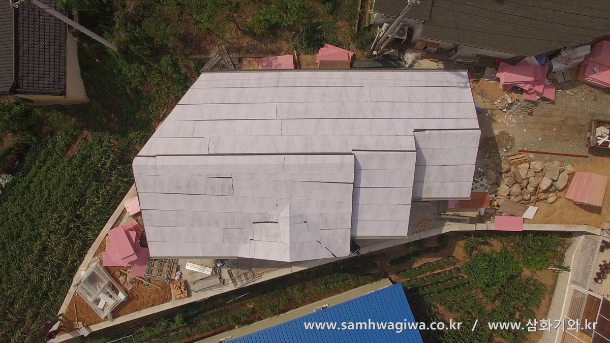 시공을 모두 마치고 하늘에서 바라본 지붕의 모습입니다. 최고급 평기와답게 지붕의 모양이 다른 S형 타입의 기와와는 전혀 다른 멋을 풍기는 것을 알 수 있습니다. 평범하지 않은 기와와 지붕의 모습이 집을 더욱 특색있고 아름답게 만들어주고 있는 느낌입니다.