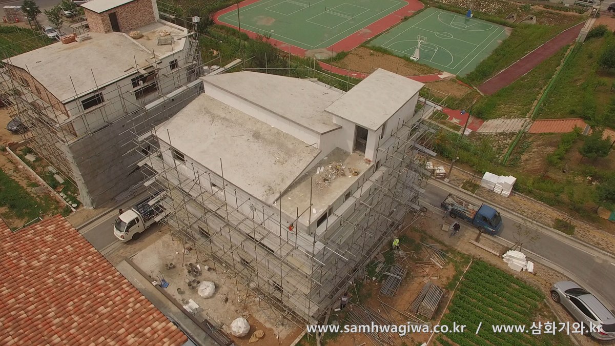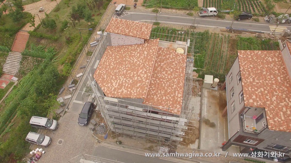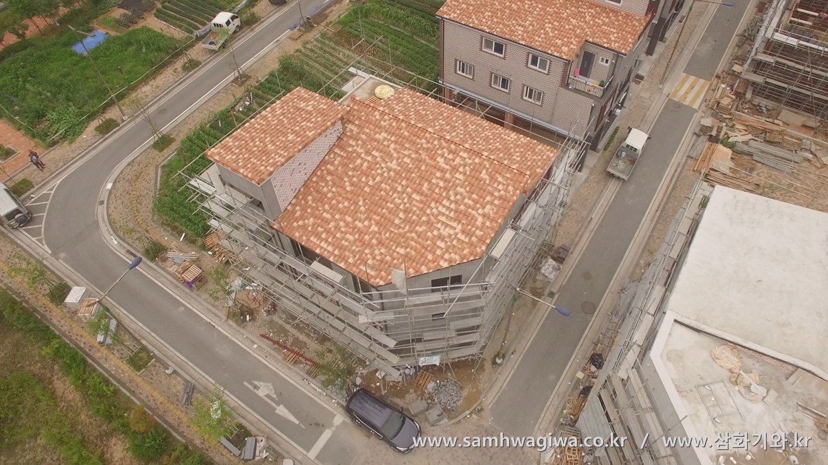 기와와 물받이까지 모든 시공이 마무리된 후에 상공에서 다양한 각도로 촬영한 사진입니다. 기와의 밝은 색상과 외벽의 색상도 잘 어우러져 보입니다. 나란히 늘어선 옆 건물과도 흡사 형제 건물처럼 잘 어울리는 모습입니다.