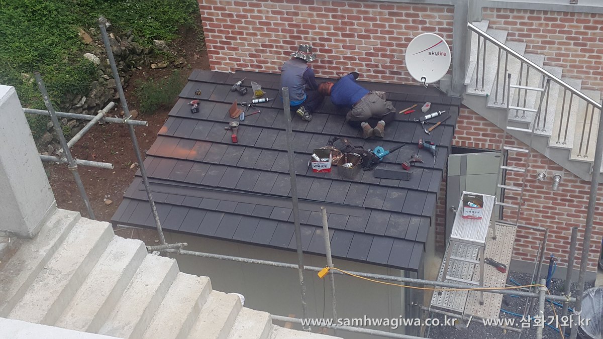 두 번째 지붕 시공과 더불어 기존에 시공했던 건물의 가적지붕도 시공에 들어갑니다. 샌드위치 패널에 가로상을 설치하고 차근차근 바닥기와를 덮어나갑니다.