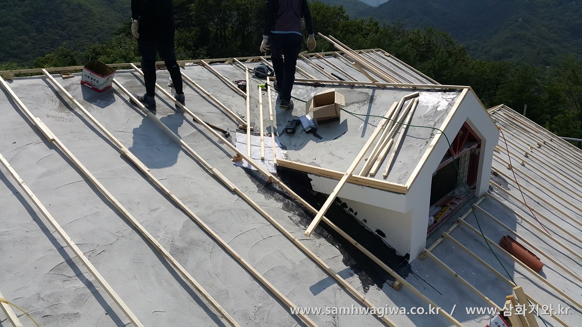 시공 닷새째 드디어 길고 힘들었던 시공이 마무리 단계에 접어들었습니다. 용마루와 박공 머리를 부착하고 창문턱에도 후레싱으로 방수 마감을 합니다. 기와에 쌓인 먼지와 각종 부스러기 등을 청소하고 마지막 정리에 들어가고 있습니다.
