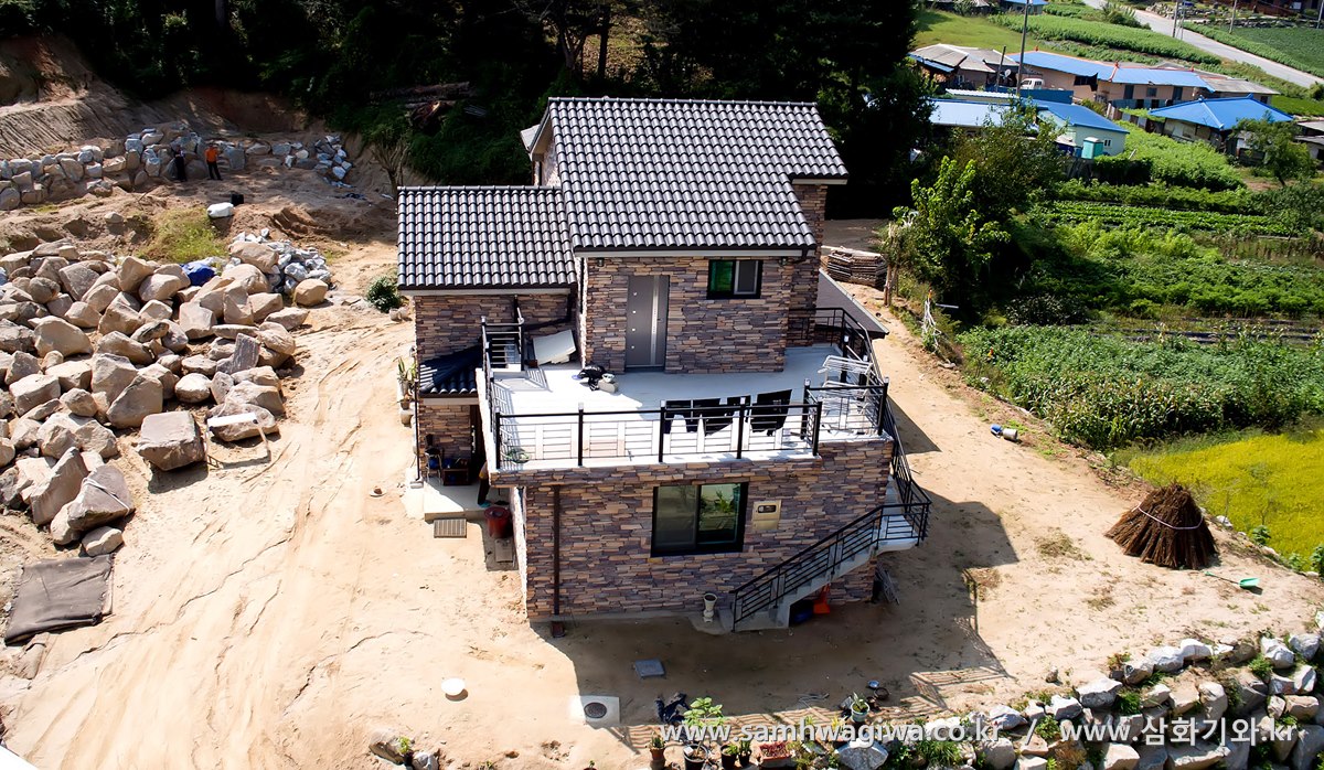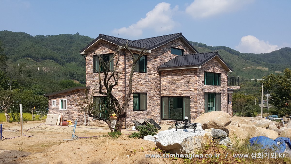 고풍스런 분위기의 파벽돌로 장식한 외벽과 중후하고 무게감 있는 검정 기와가 아주 멋진 조합을 이루고 있는 모습입니다. 이제 마당의 조경이 완성되고 나면 한폭의 그림 같은 집이 탄생할 것이라고 믿어 의심치 않습니다.