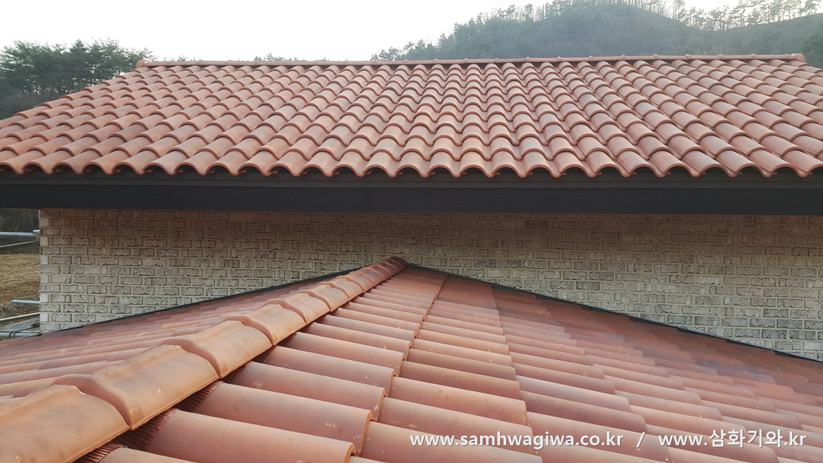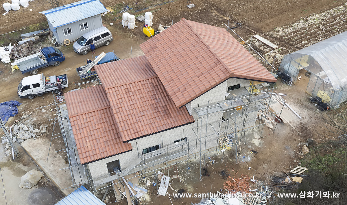 작업이 모두 마무리되었습니다. 이번 현장은 물받이의 설치 없이 자연낙수를 하도록 시공한 현장이므로 처마 쪽의 마감이 뭔가 더 자연스러운 느낌입니다. 벽돌의 밝은 색상과 진한 적색 계열의 기와가 잘 어울려 멋진 하모니를 이루고 있네요. 건축주 또한 울긋불긋한 색상보다는 단색 계열의 색상을 원하셨던지라 아주 마음에 들어하시는 모습이었습니다.