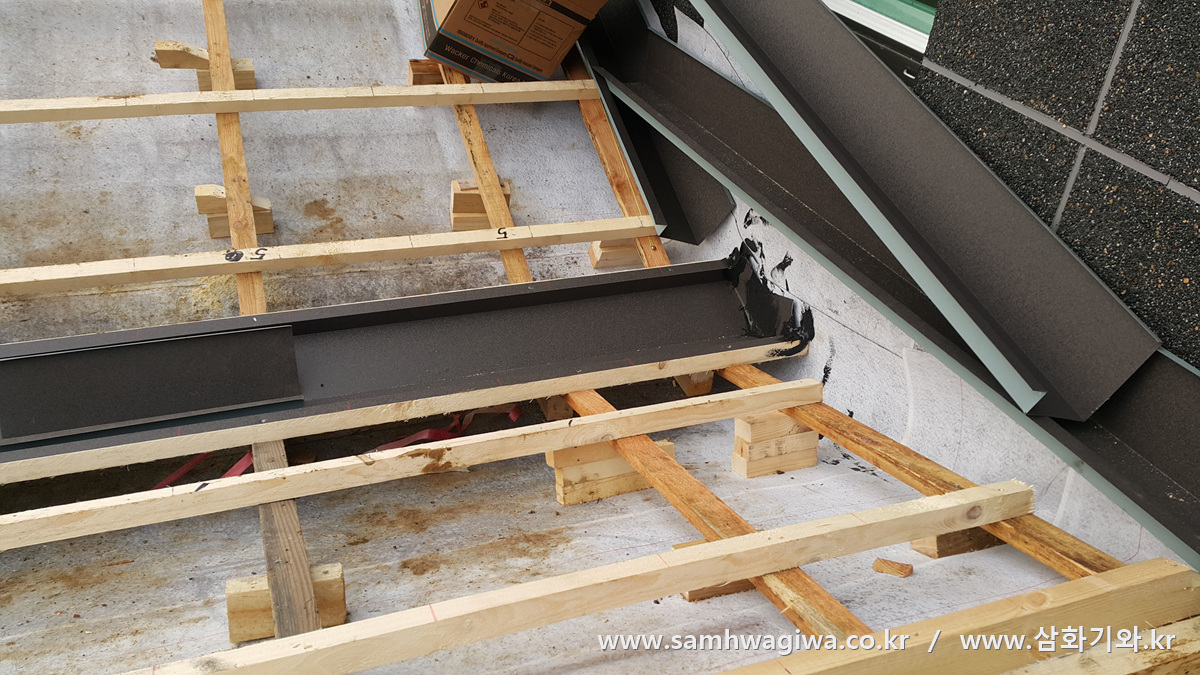 기와골에 모이는 빗물이 배수되는 밸리 후레싱의 모습입니다. 아직 벽체에는 후레싱을 붙이기 전입니다. 벽체에서 흐르는 빗물도 이 밸리 후레싱으로 함께 모여 배수되도록 작업해야 합니다.