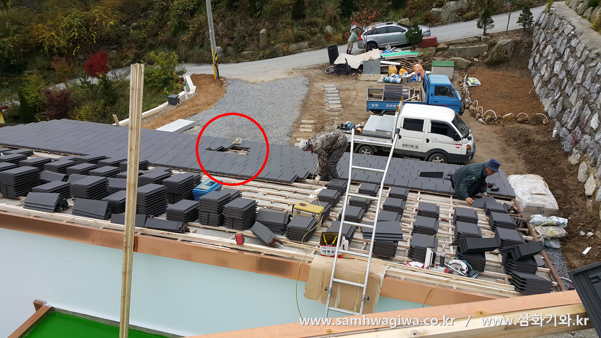 각상 작업을 실시한지 두 달 여가 지난 10월 하순의 모습입니다. 동후레싱 부착이 모두 완료되었고 전면 물받이도 이미 설치되어 있으며 외벽에는 스타코로 마감이 끝나 있습니다. 첫 각상 작업이 끝나고 오랜 시간이 지난 후여서 그런지 꽤나 많은 것이 달라져 있는 모습입니다. 작업이 이렇게 예상 외로 많이 늦어지게 된 이유는 벽난로 때문인데요, 유럽에서 직접 배를 타고 운송되는 과정에서 한진해운 사태 때문에 발목이 잡혀 아직 배송이 이루어지지 않았기 때문입니다. 아직도 언제 배송될지 기약이 없는 상태인지라 마냥 지붕을 방치할 수 없어 일단 급한 대로 기와 시공부터 진행하기로 합니다.