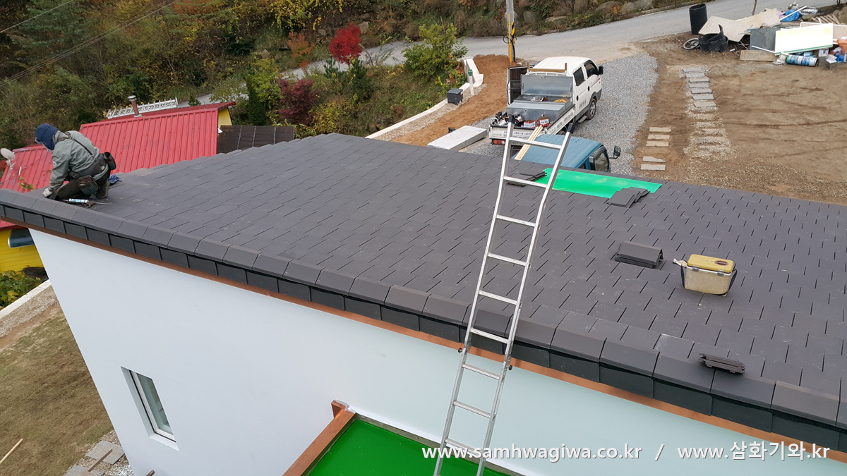 작업이 모두 끝난 후의 모습입니다. 굴뚝 부분만 제외하면 완벽하게 마무리되었습니다. 모던하고 세련된 평기와가 무척이나 잘 어울리는 느낌입니다. 이제 굴뚝 작업이 마무리되었다는 연락을 기다리는 일이 남았습니다.