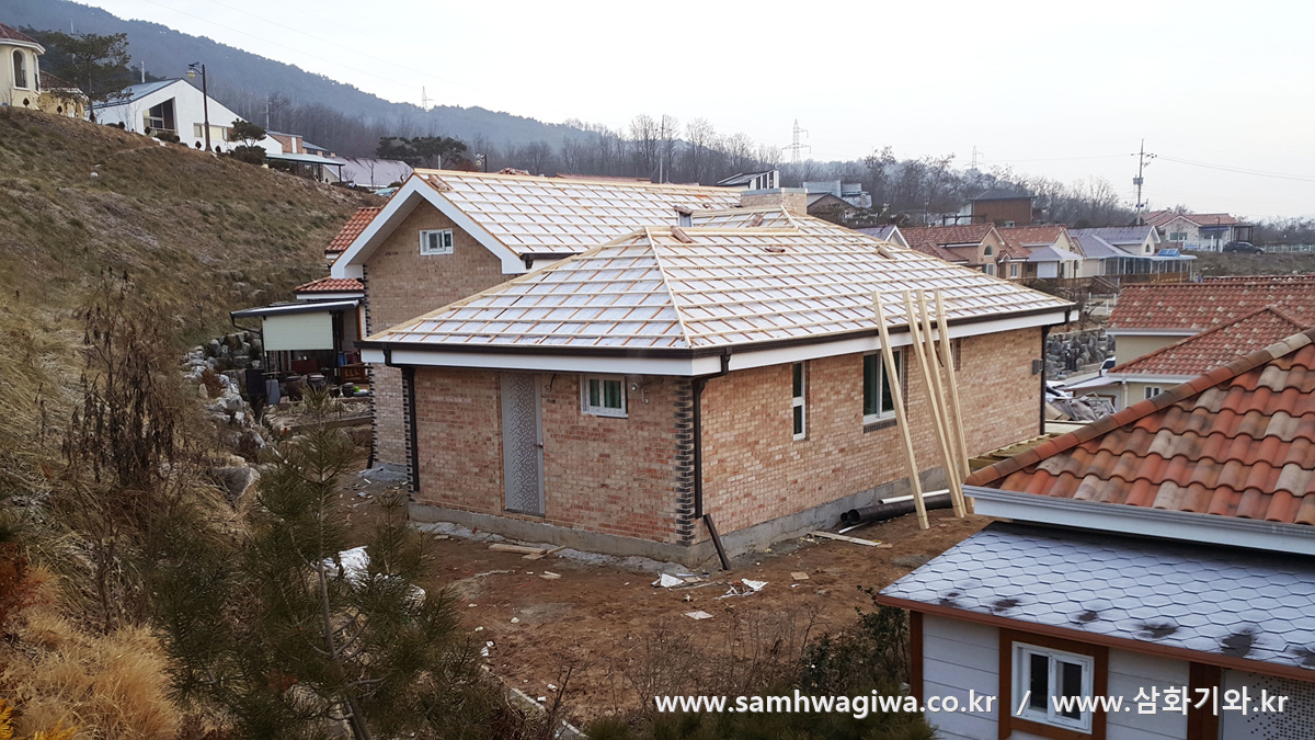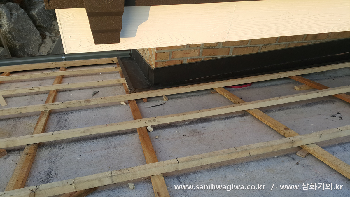 어느 정도 시간이 경과한 후, 기와 시공을 위해 다시 현장을 찾았습니다. 외벽에는 벽돌 시공이 끝나 있는 것이 보입니다. 목조 주택이라 지붕면이 평평하므로 가로상만 시공해도 큰 무리가 없지만 완벽하고 하자 없는 시공을 위해 이중상으로 작업합니다. 기초가 될 세로상을 설치하고 있는 모습입니다.