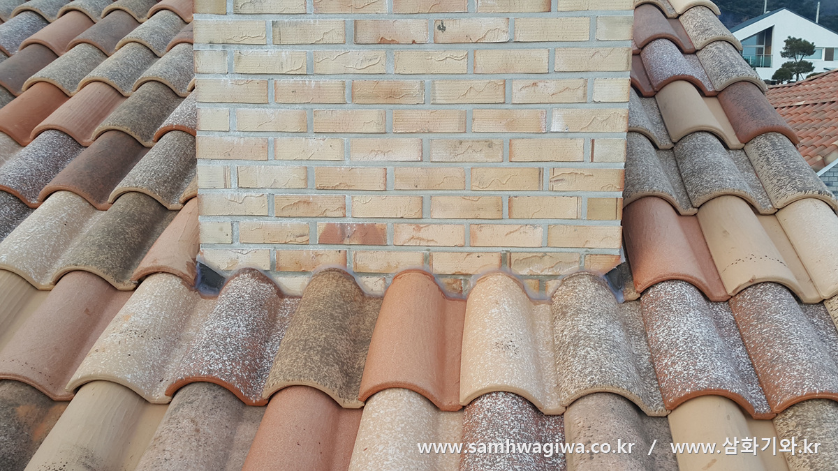 굴뚝 주변을 시공한 모습입니다. 굴뚝 옆면과 뒷면은 기와 밑면에 후레싱이 감싸고 있지만 앞면의 경우에는 후레싱이 없으므로 기와를 최대한 정밀하게 재단하여 실리콘으로 잘 실링해 줍니다. 하지만 실리콘만으로는 부족하므로 나중에 후레싱을 둥글게 재단하여 부착해 최종 마감하여야 합니다.