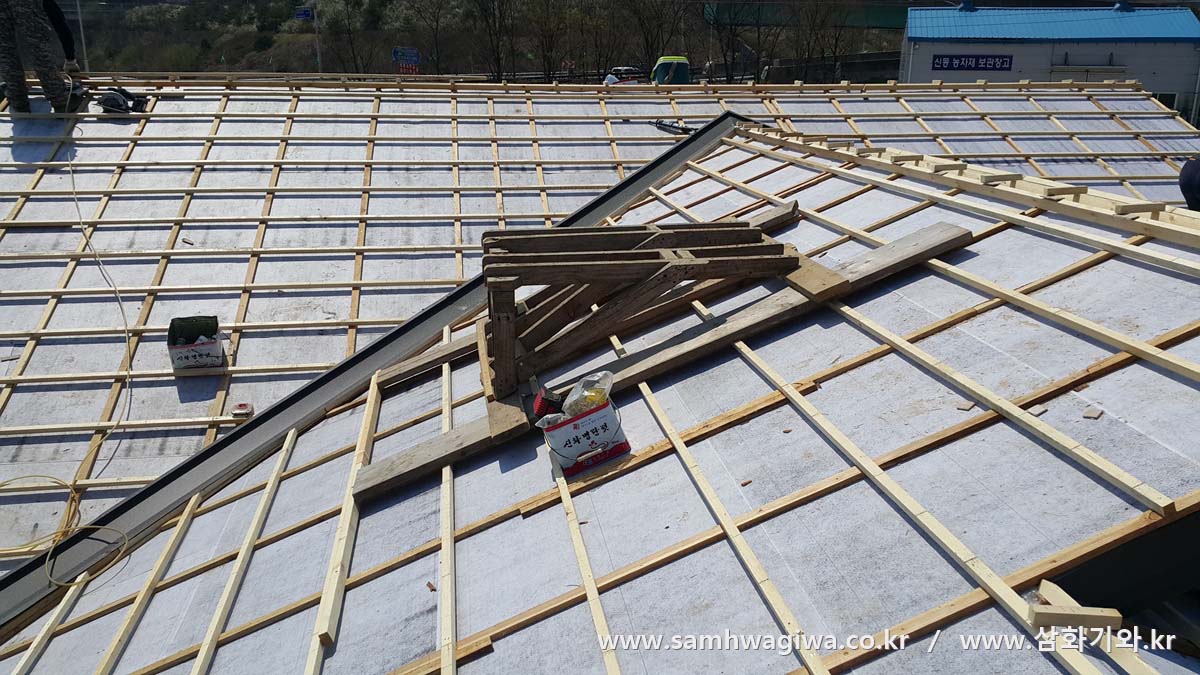 밸리 후레싱 작업도 모두 마감되었습니다. 이번 현장 같은 샌드위치 패널 지붕은 지붕면이 평평하므로 가로상 작업만으로도 시공이 가능하지만 이중상으로 각상을 시공합니다. 이렇게 작업하면 기와 아래의 통풍에도 유리하며 혹시 빗물이 누수되더라도 빠르게 아래로 배출됩니다.