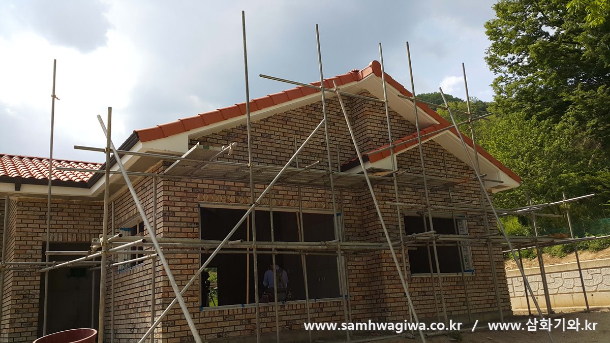 아직 벽돌에 줄눈 작업이 이루어지지 않아 벽체와 기와가 만나는 곳에 후레싱을 부착하지 못한 모습입니다. 차후에 줄눈 작업이 마무리되고 후레싱을 부착하면 완벽한 방수가 이루어집니다. 일단 실리콘으로 꼼꼼하게 마감하여 처리합니다.