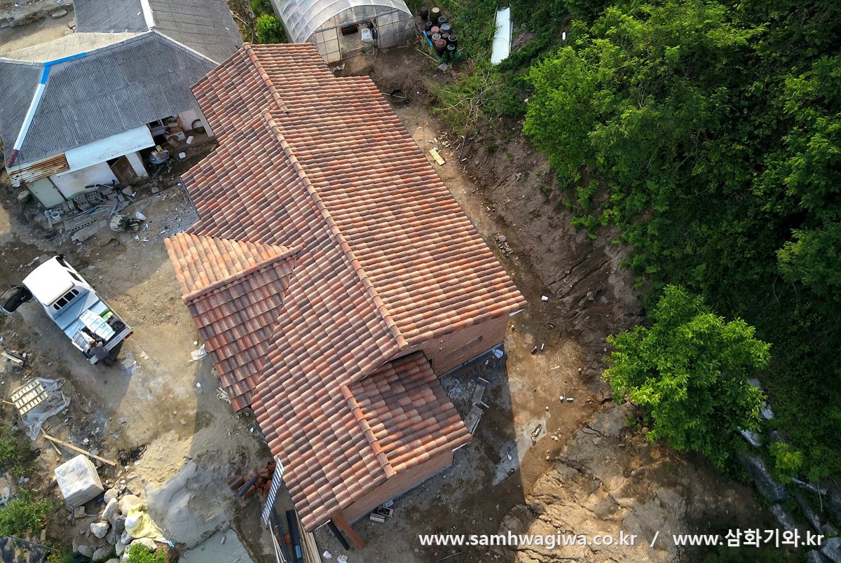 바닥기와가 어느 정도 마무리 되었습니다. 용마루 부착 작업이 일부 진행된 것이 보이네요.