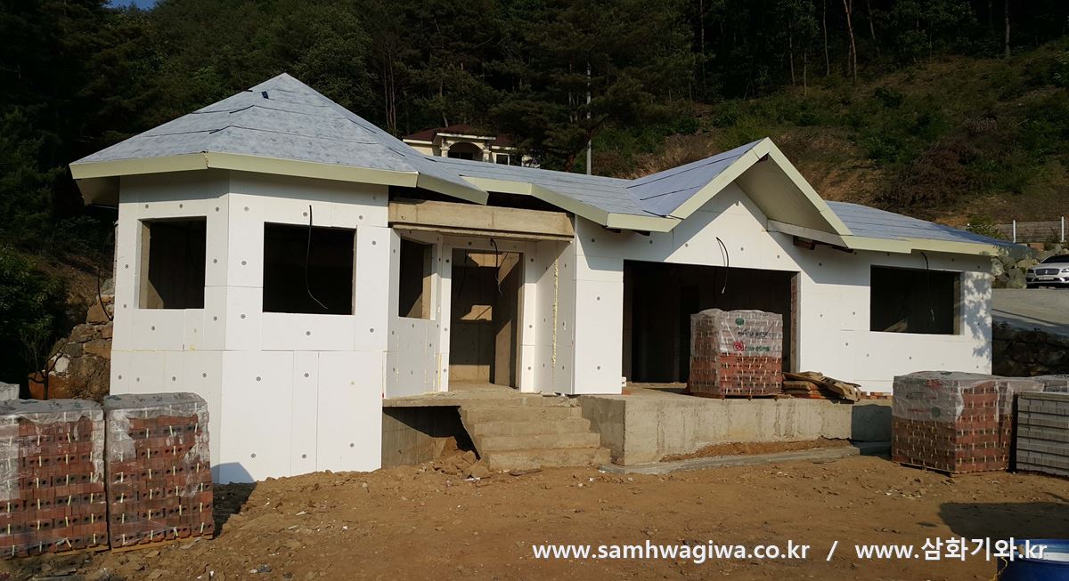 실측을 위해 다시 방문했을 때의 모습입니다. 지붕 구성이 모두 끝나고 방수 시트까지 덮여진 상태입니다. 마당에는 외벽 마감을 위한 벽돌이 쌓여 있는 것이 보이네요. 지붕 시공은 벽돌 조적이 완료된 후 시작되므로 시공일 전까지는 안전한 작업을 위해 비계를 설치해줄 것을 요청하고 현장에서 철수합니다.