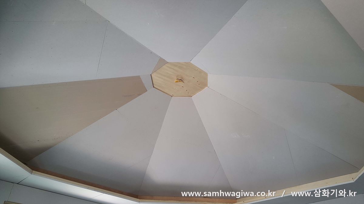 팔각 지붕 때문에 예정보다 시간이 많이 소요되었지만 각상 작업이 모두 마무리되었습니다. 하지만 기와 인양을 시작하기 전에 물골 및 굴뚝 주변 후레싱을 마감해 놓아야 하므로 작업에 박차를 가합니다.