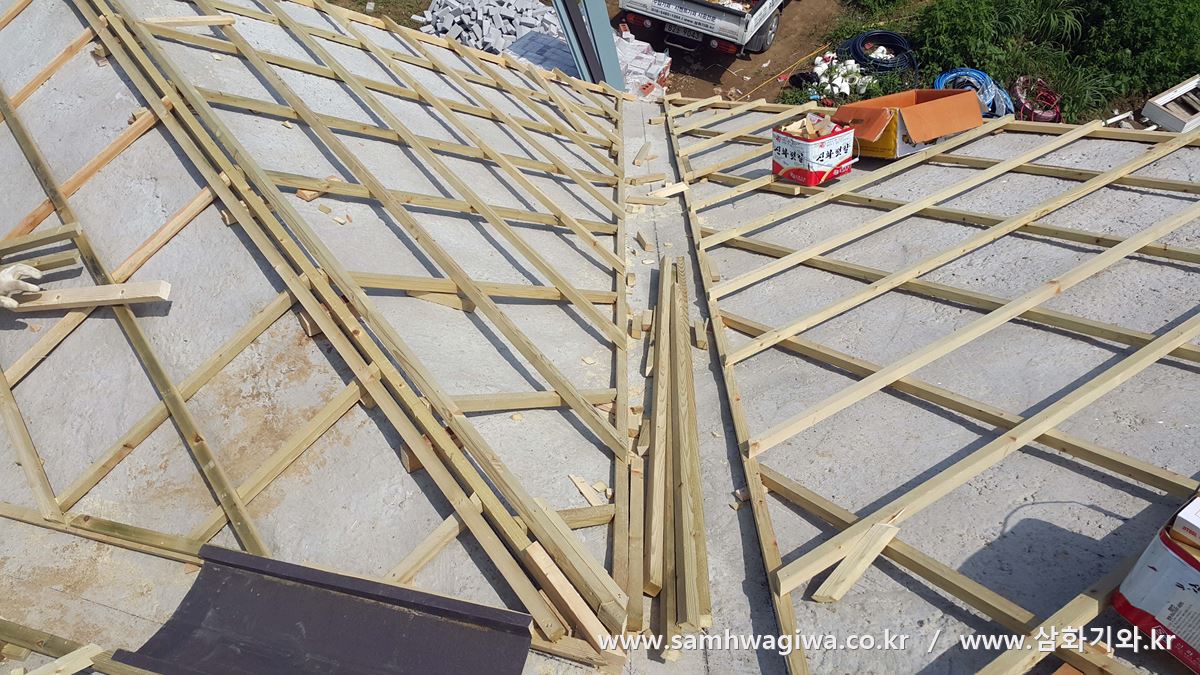 해당 부분에 기와를 덮어가는 도중의 사진입니다. 밸리 후레싱이 기와 아래로 연결되어 아래쪽 물받이까지 연결된 모습이 보입니다. 해당 부위의 기와는 매우 정교하게 시공해 놓은 상태인지라 실수로 밟지 않도록 ‘주의’라고 표시해 놓은 것이 보이네요.