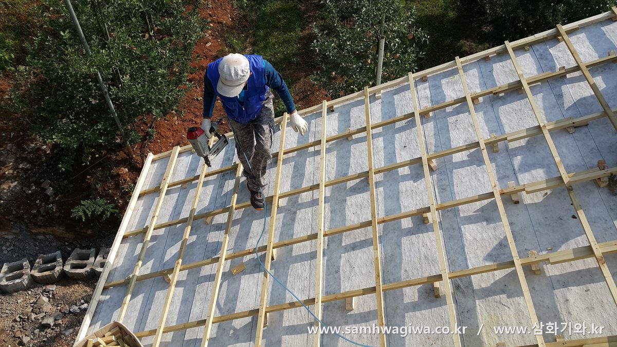 기와가 도착하고 지붕에 고르게 펼쳐 놓습니다.