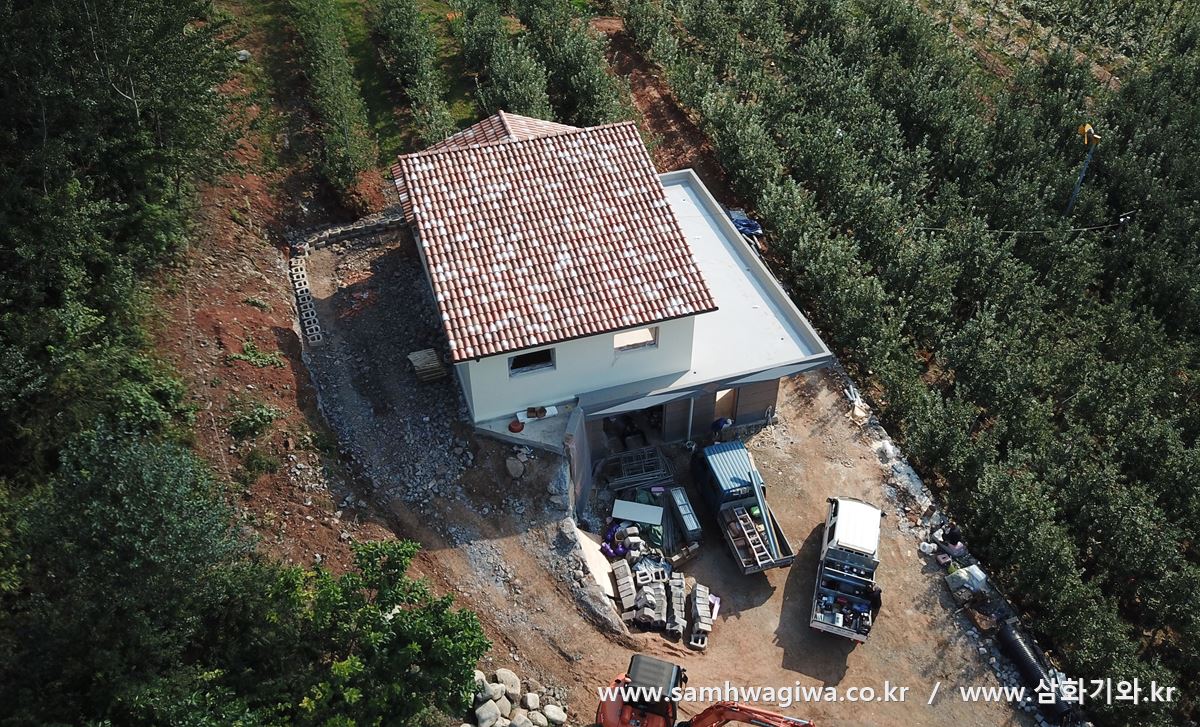 지붕이 전체 건물 면적을 덮는 구조가 아니라 1층에 평슬라브 옥상이 있어 지붕 면적이 큰 편은 아닙니다. 지붕 모양도 단순하게 설계하였으므로 시공에 큰 어려움은 없을 것으로 보이네요. 외벽과 기와면이 인접하는 곳의 방수 처리만 신경 써서 잘 하면 나머지 공정은 수월하게 진행될 것 같습니다.