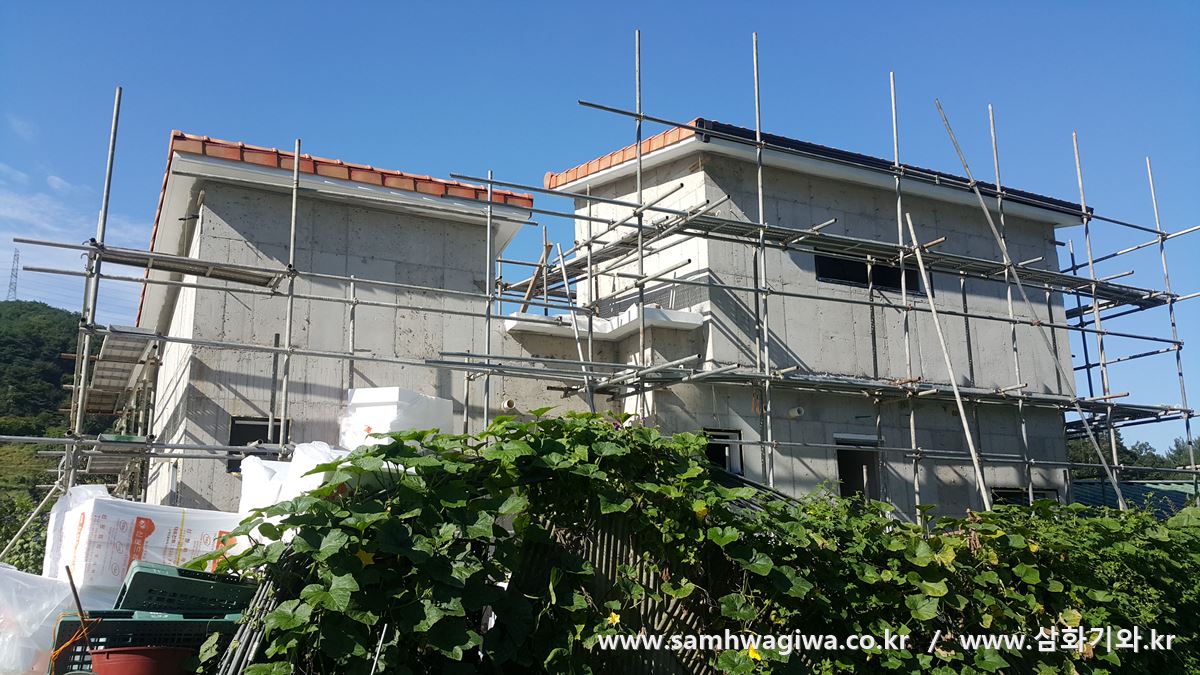 시공이 모두 마무리되었습니다. 기와면이 많이 보이지는 않지만 심플하고 단정한 느낌입니다. 복잡하게 멋을 잔뜩 낸 지붕보다는 이런 단순한 설계가 하자의 위험도 없고 보기에도 훨씬 깔끔해 보입니다.