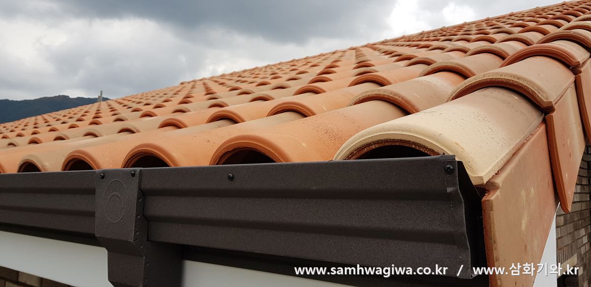 수평도 잘 잡혔고 기와 줄도 아주 반듯반듯하게 예쁘게 시공되었습니다. 하부 각재 작업을 엉성하게 하게 되면 이런 예쁜 장면이 절대 나오지 않습니다. 멀리서 언뜻 보면 그럴 듯해 보이는 지붕도 위 사진들과 같이 눈높이를 낮춘 각도에서 관찰하면 구불구불 울퉁불퉁한 경우가 무척 많습니다.