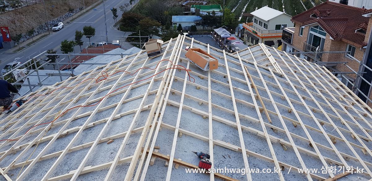 가로상을 설치한 모습입니다. 튼튼하게 잘 설치되었습니다. 이제 기와를 얹고 사람이 올라서도 끄떡없습니다.