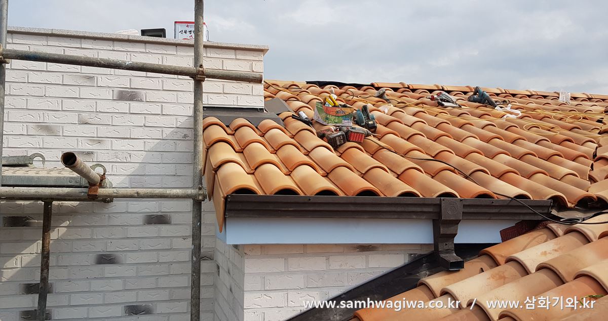 기존에 없던 기와면을 새로 만들어 주고 있습니다. 이렇게 하면 복잡하게 꺾이는 배수 경로를 단순하게 줄일 수 있습니다.