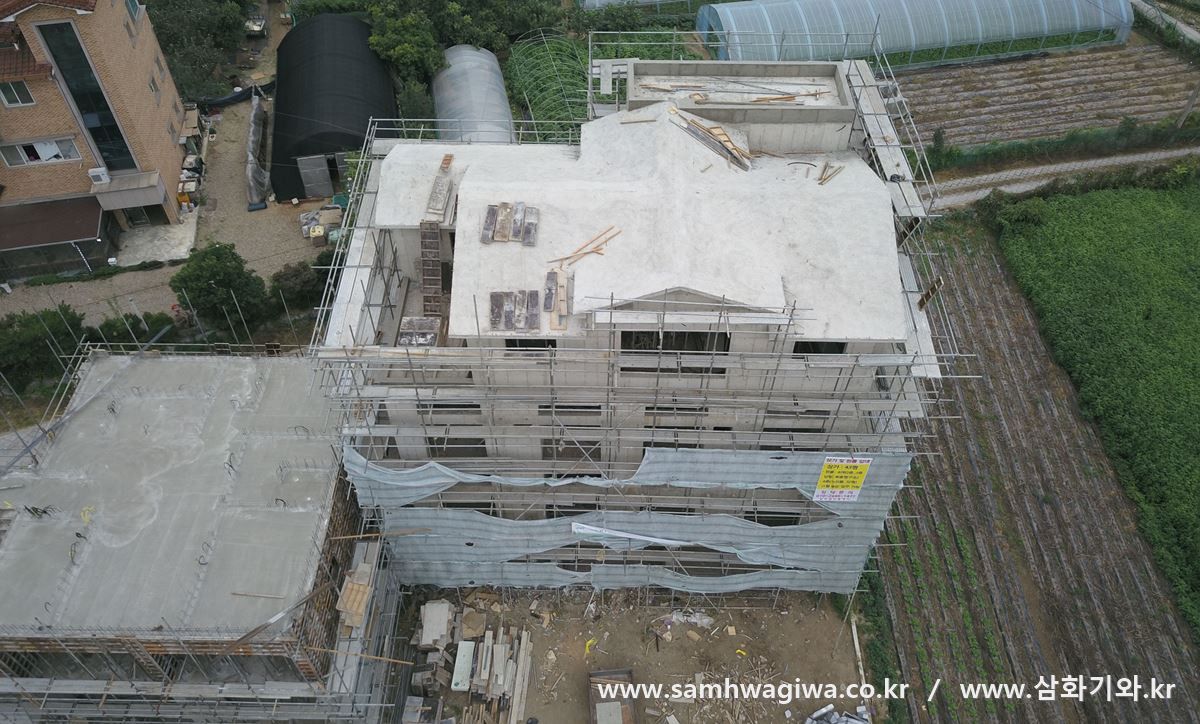 드디어 시공이 모두 끝났습니다. 여러 가지로 난관도 많았고 난이도가 높은 현장이었지만 무사히 잘 마무리가 되어 다행입니다. 이번 현장의 바로 옆에도 3층 상가 건물이 시공 중인데요, 곧바로 옆 건물의 기와 시공에 들어가게 됩니다. 바로 아래 항공 사진에 옆 건물을 시공 중인 사진이 찍혀 있네요.