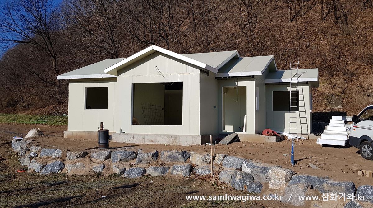 이번 현장은 단양군 어상천면에 위치한 개인주택 신축현장입니다. 샌드위치 패널로 골조와 지붕을 구성한 단층 주택으로서 지붕의 모양은 변형된 T자형의 구조입니다.