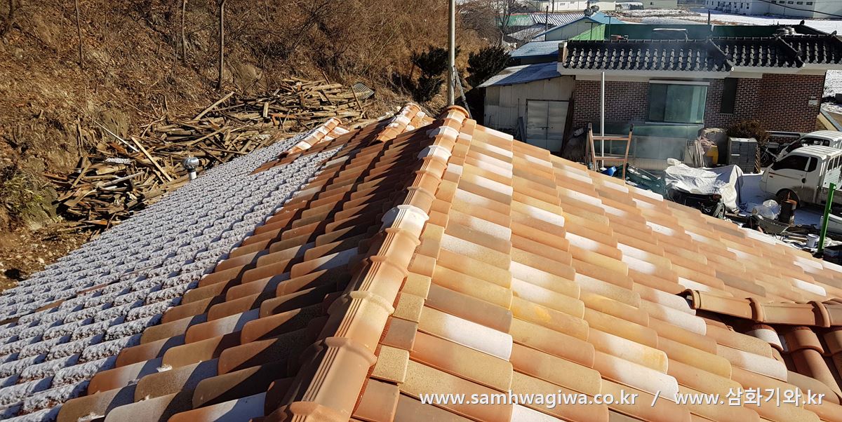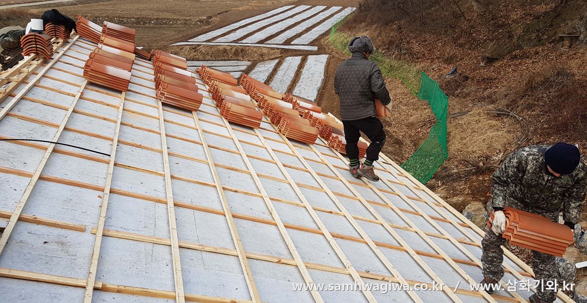 기와 시공이 완성된 뒷쪽 지붕면은 눈이 쌓여도 상관없지만 아직 시공이 이루이지지 않은 앞쪽 지붕면에는 눈이 쌓일 경우 시공이 어렵습니다. 눈의 경우에는 빗물과 달라 완전히 녹기 전까지는 말끔히 제거하기도 힘들기 때문입니다. 방수 포장으로 지붕면에 눈이 쌓이지 않도록 덮고 있습니다.