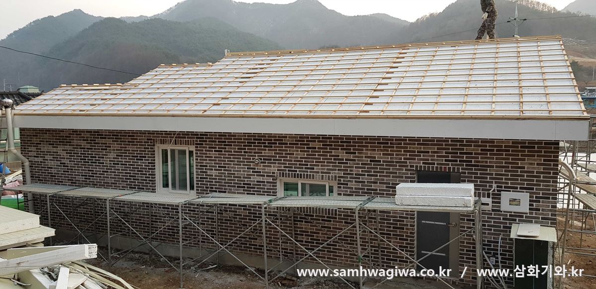 한참의 시간이 지나고 드디어 기와 시공에 들어갑니다. 벽돌은 위 사진처럼 고벽돌 느낌이 나도록 시공했네요.