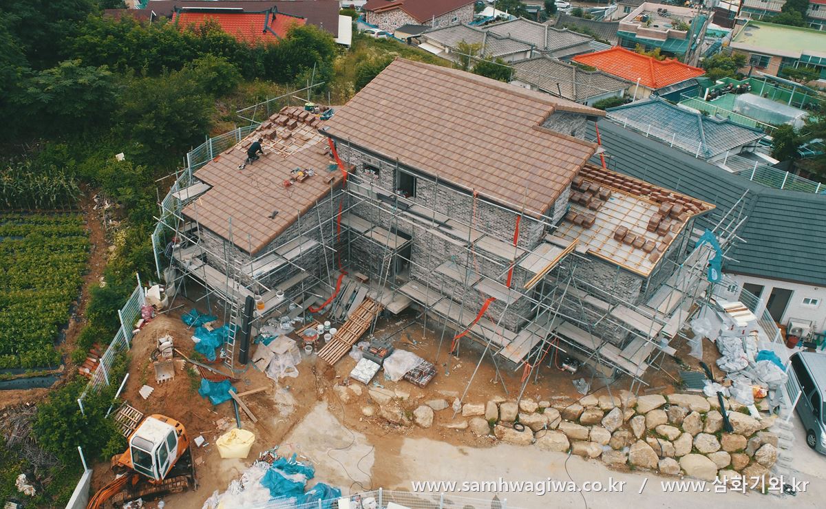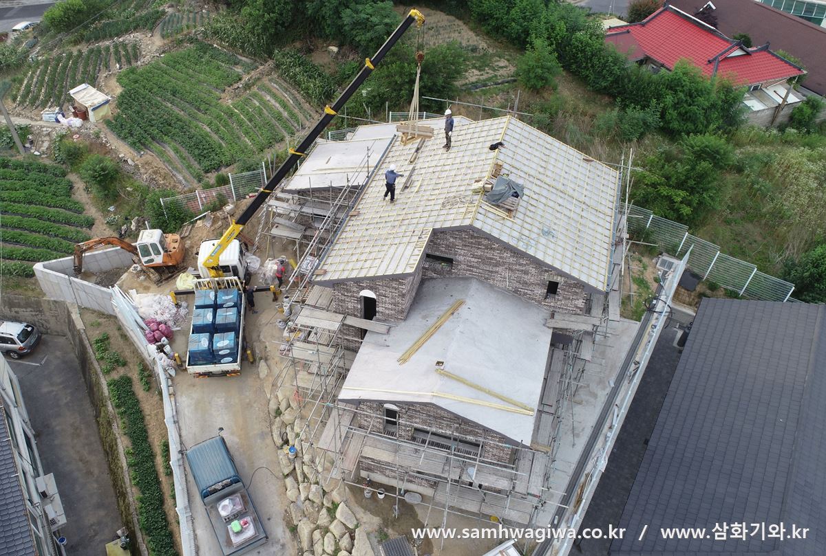 하늘에서 바라본 모습입니다. 2층 지붕은 아주 깔끔하고 멋지게 마무리되었네요. 이제 1층 지붕의 각상 시공에 들어갈 순서입니다.