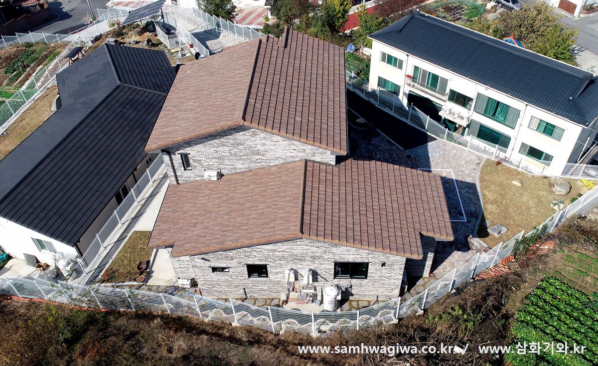 이번 현장에 사용된 기와는 프랑스의 이머리스(Imerys)사에서 생산된 ‘알파10’ 평기와 중 ‘슈브르즈’라는 제품명의 기와입니다. 일반적인 단색 계열의 평기와에서 탈피한 변색 평기와로서 따뜻하면서도 부드러운 느낌을 동시에 가진 특색 있는 평기와입니다. 국내에서는 (주)함라에서 수입을 맡고 있습니다.