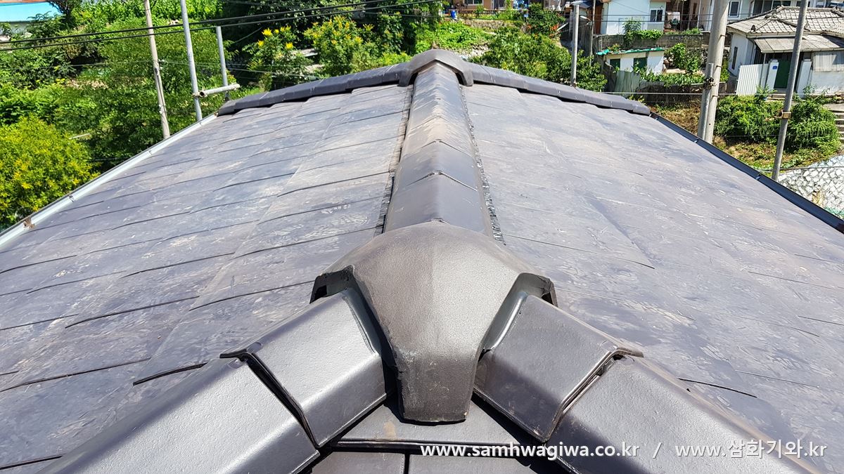 계단실 지붕에 새롭게 짠 모임지붕도 잘 마무리가 되었습니다. 용마루가 교차하는 부분에는 삼방향 마감기와를 사용하여 깔끔하게 시공을 끝냅니다.