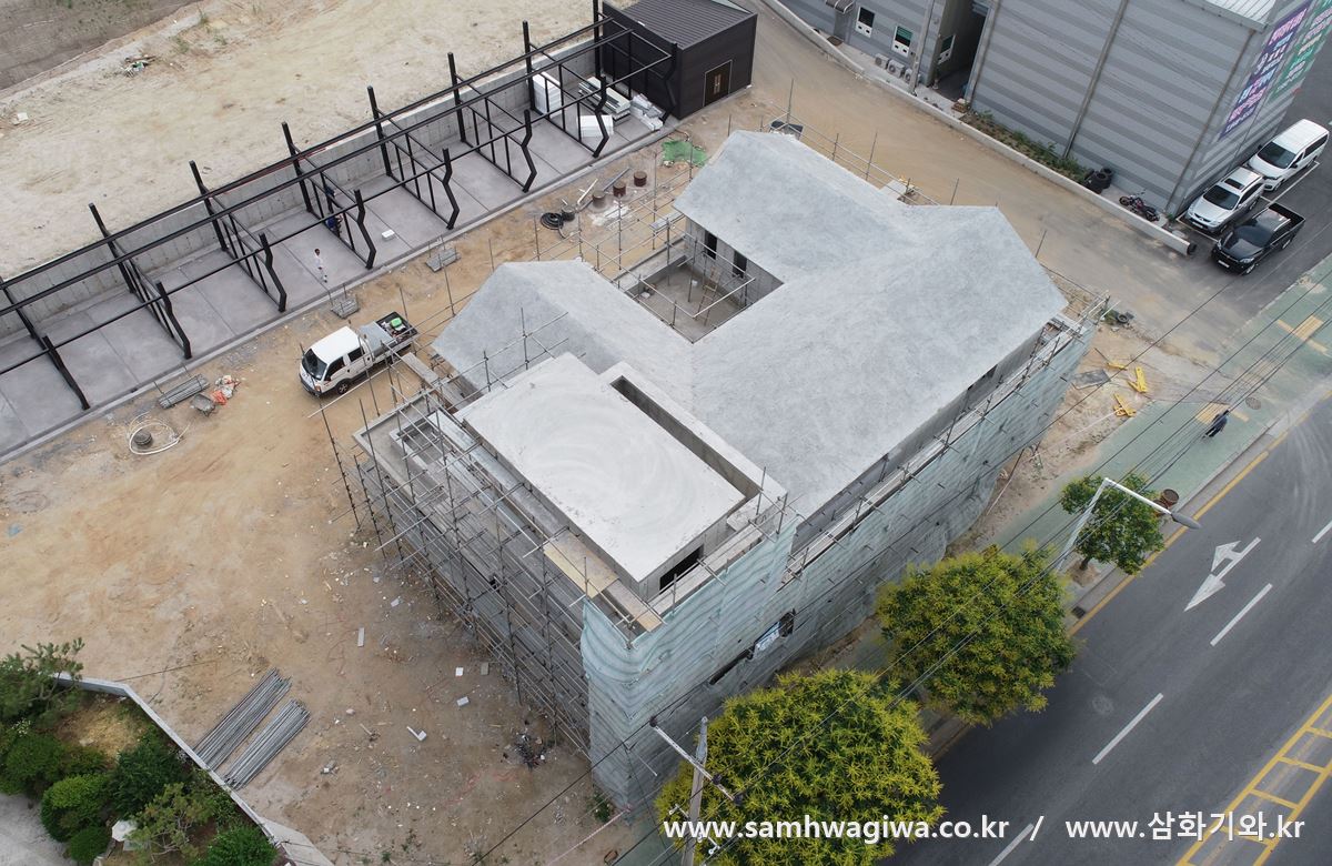 하늘에서 바라본 지붕의 모습입니다. 전체적으로는 ㄷ자 형태의 외양을 가지고 있지만 건물 오른쪽에 계단실 지붕이 따로 솟아 올라 있는 것이 보입니다. 이 계단실 지붕은 현재 상태는 평슬라브로 시공되어 있어 기와 시공이 불가능하지만 이곳에도 기와를 시공하고 싶다고 건물주께서 요청하신 상태입니다.