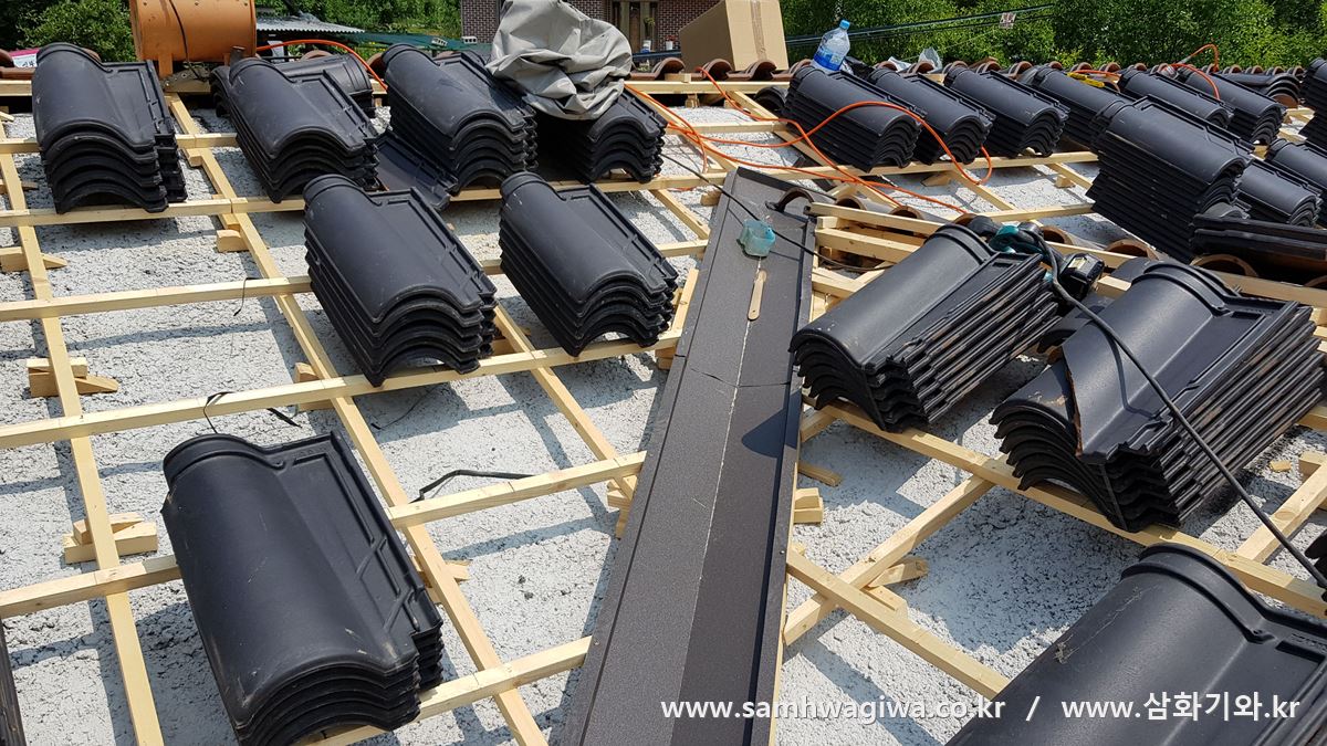 차근차근 기와를 펼쳐놓고 시공에 들어갑니다. 이번에 시공될 기와는 마자론의 검정 기와인 ‘네그라’라는 제품입니다.