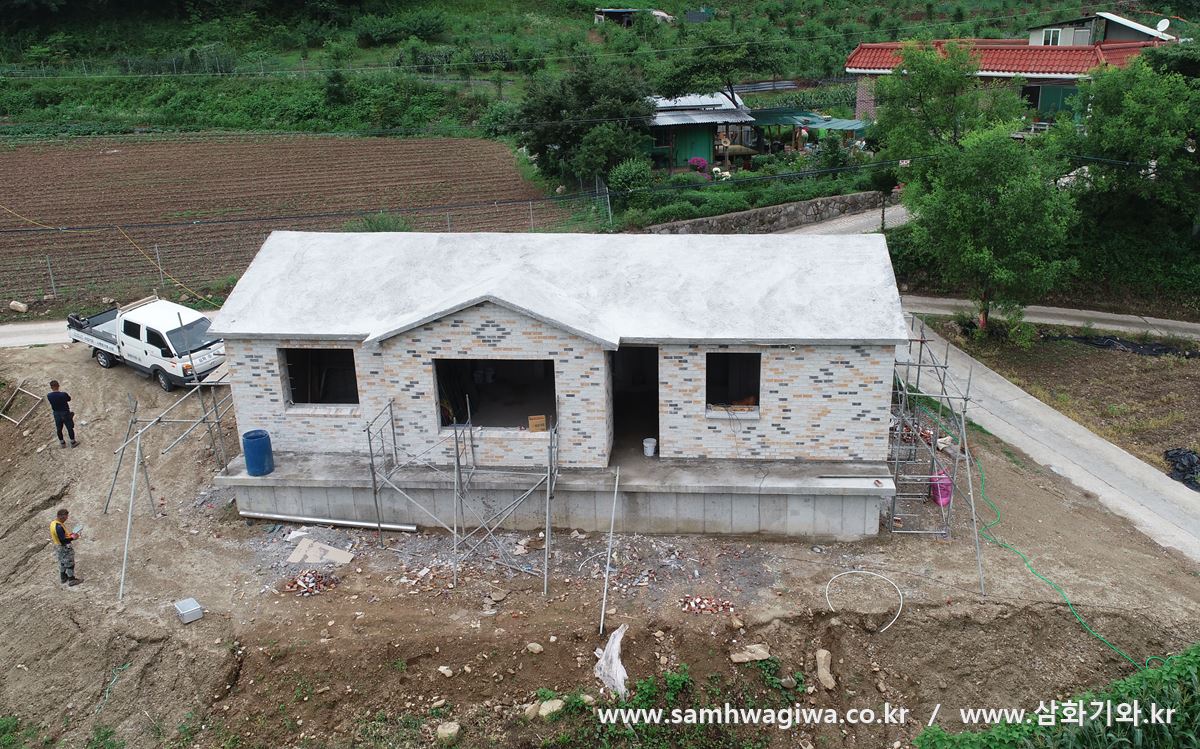 견적을 위해 최초 방문했을 당시의 모습입니다. 이미 외벽 벽돌 조적과 줄눈 작업이 끝난 상태이며 내부에는 천장 인테리어까지 마친 상태네요. 콘크리트 슬라브 지붕의 경우 양생이 이루어지면서 지붕면에 실금이 생기는 경우가 잦고, 그 틈을 타고 비가 새기 때문에 보통은 지붕 기와 시공이 끝난 후에 인테리어를 시작하는 것이 일반적인 순서인데 다행히 이번 현장은 비가 새지 않았나 봅니다.