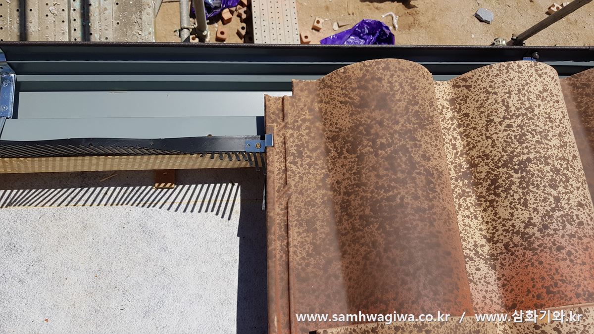 첫 번째로, 이런 식으로 갓기와의 각도에 맞추어 기와 전체의 각도를 수정하는 방법이 있습니다. 각이 많이 뒤틀리지 않은 경우에는 이렇게 시공해도 크게 무리가 없습니다.