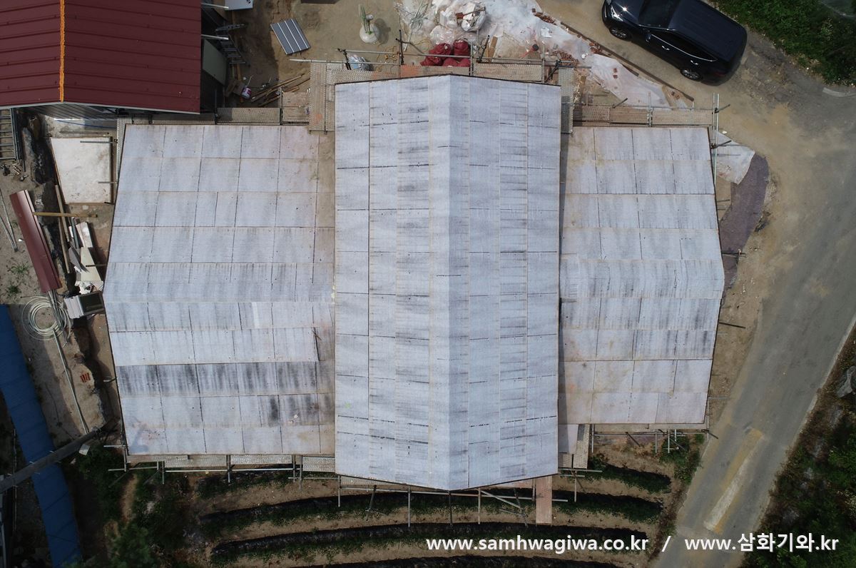 기와를 고르게 펼쳐놓고 작업 준비를 마칩니다. 벽체와 맞닿는 부분은 미리 후레싱을 심어 놓아 빗물이 흐를 유도로를 만들어 줍니다.